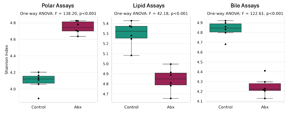 Antibiotic treatment drastically reduced crucial lipid and bile acid diversity, reinforcing metabolic diversity as a key biomarker of gut health. These findings underscore the microbiome’s critical role in regulating metabolic homeostasis, impacting lipid signaling, energy metabolism, and host-microbe interactions.