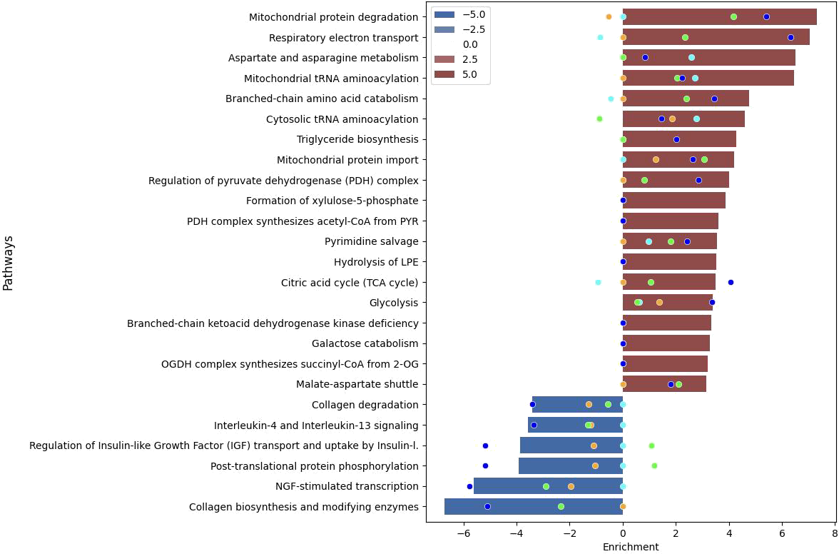 - Pathway-level shifts: 194 dysregulated pathways were identified, along with additional molecular patterns that complement single-omics studies, including mitochondrial metabolism, amino acid catabolism, and growth signaling.