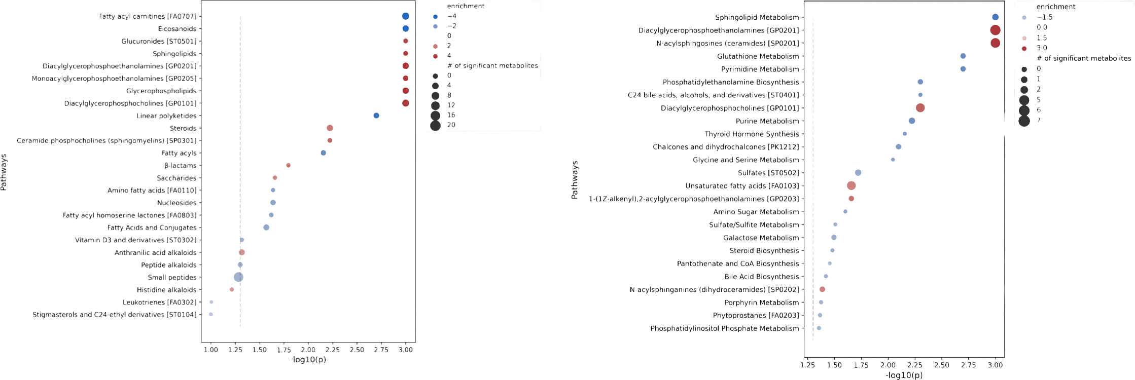 Figure 2: Pathway enrichment analysis of liver (left) and serum (right) metabolomics data. The dot plots show enriched pathways and their significance (x-axis), with the p = 0.05 threshold marked by a gray dashed line. Dot size indicates the number of significantly different metabolites, and color represents the enrichment ratio.