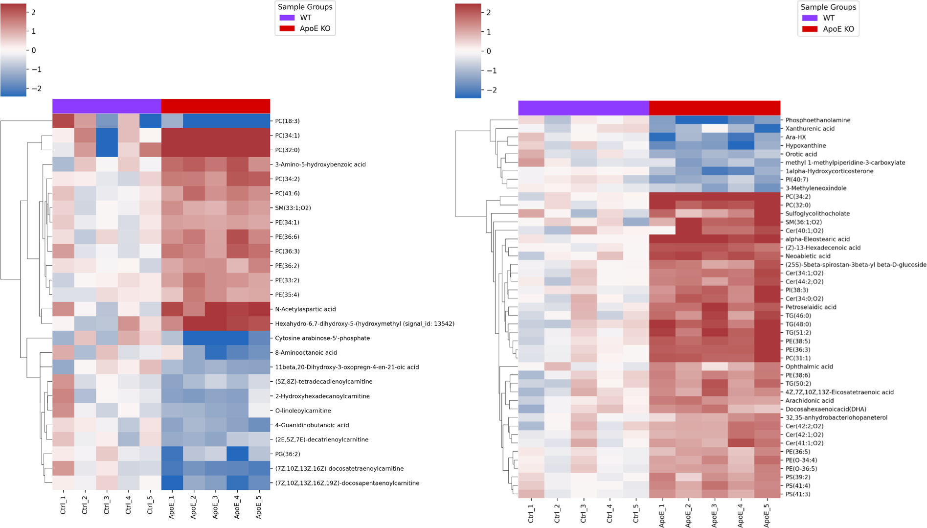 The global metabolic shift (Figure 3) observed in both peripheral tissues of ApoE knockout animals suggests that the consequences of ApoE deficiency extend far beyond the central nervous system. This finding aligns with emerging evidence that Alzheimer’s disease involves systemic metabolic dysfunction rather than being purely a brain disorder. For drug development programs, this systemic metabolic phenotype offers the potential to use peripheral biomarker discovery as a window into central therapeutic effects, potentially accelerating the development timeline by enabling pharmacodynamic monitoring without requiring cerebrospinal fluid sampling or PET imaging.