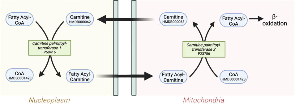 Figure 4: Diagram of carnitine shuttle. Fatty acyls are transported into the mitochondria after conversion to fatty acylcarnitines, allowing them to enter the β-oxidation pathway for energy production.