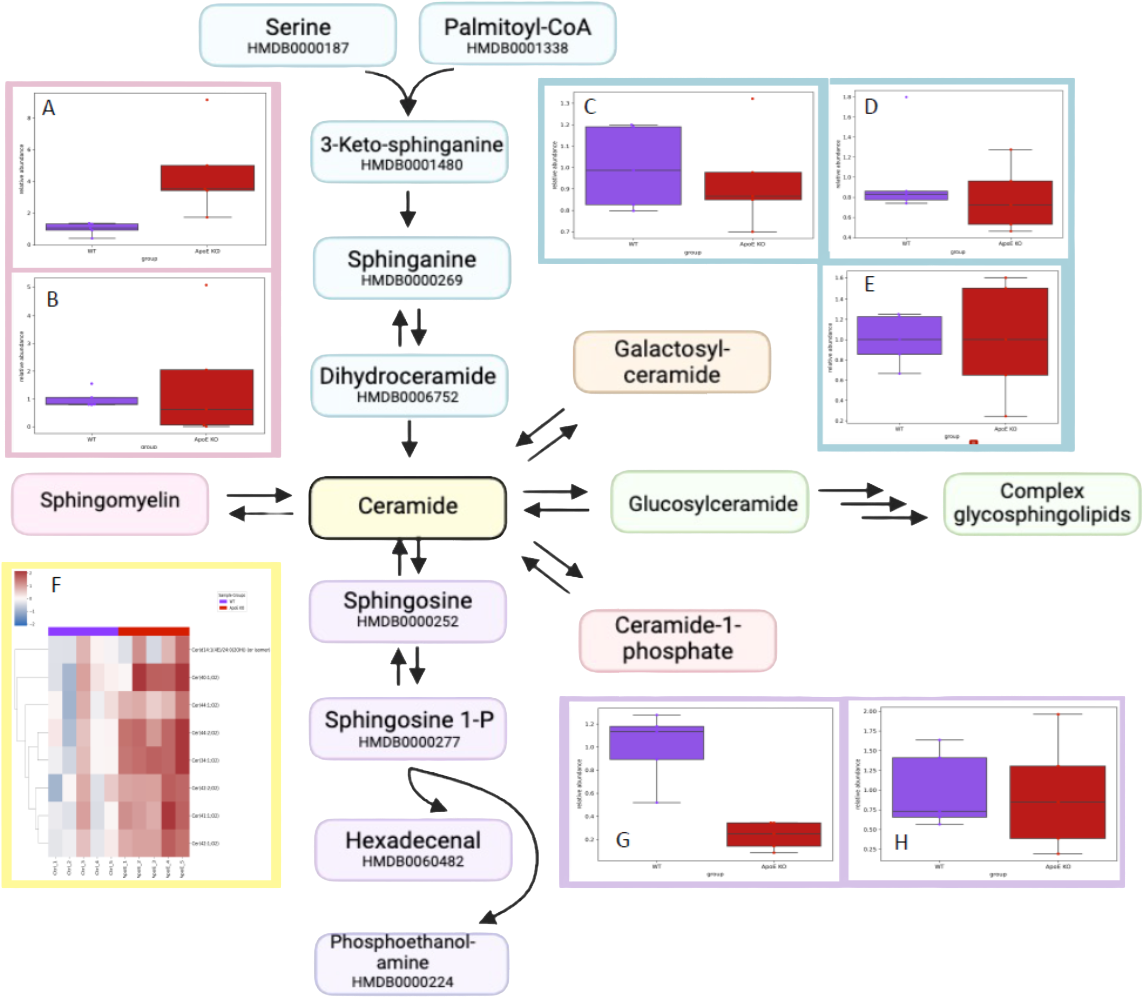 Figure 5: Sphingolipid metabolism pathways are shown. (A–B) Sphingomyelinase (pink): SM(36:1;O2) was enriched in ApoE KO, SM(d17:1/26:1)* was not. C–E) De novo (blue): no significant differences. F) Ceramide heatmap: 8 ceramides enriched in ApoE KO (log2 fold change). G) Catabolic (purple): phosphoethanolamine was enriched, sphingosine 1-P* was not (*or isomer).