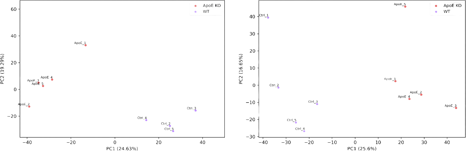 Figure 2: Unsupervised principal components analysis (PCA) visualizes the global metabolite profiles of liver (left) and serum (right) samples. Together it highlights clear trends and separation between groups, reflecting distinct metabolite concentration patterns in both tissues.