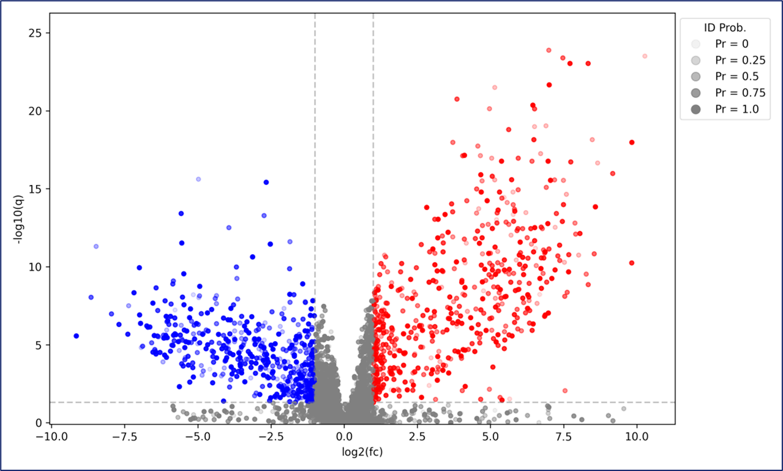 Figure 2: Volcano plot of significantly altered metabolites. Blue dots represent significantly reduced and red dots significantly enriched metabolites in Alzheimer’s patients.